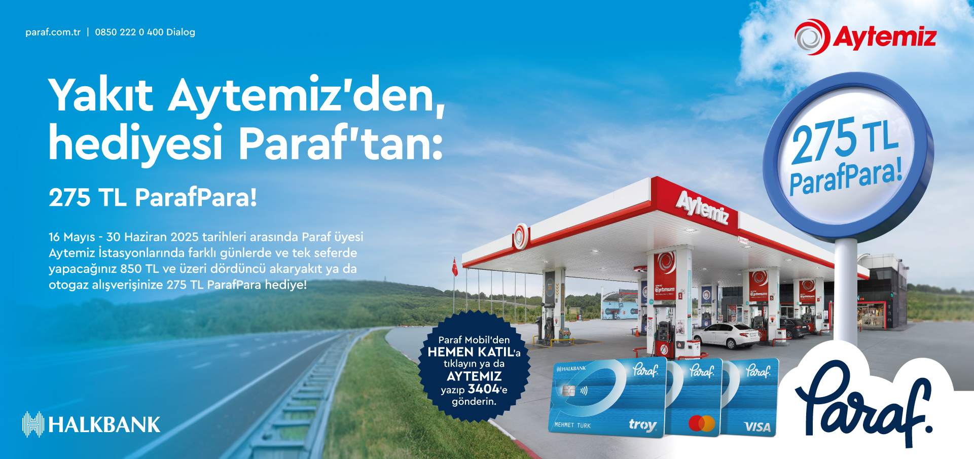 Kurban Bayramı ve yaz tatiline sayılı günler kala Aytemiz ve Halkbank, Paraf Kart kullanıcılarına özel akaryakıt ve otogaz alımlarında yeni bir fırsat sunuyor. 16 Mayıs – 30 Haziran tarihleri arasında, akaryakıt veya otogaz alışverişlerini Aytemiz istasyonlarında Halkbank Paraf Kart ile yapanlar, 275 TL ParafPara kazanıyorlar.